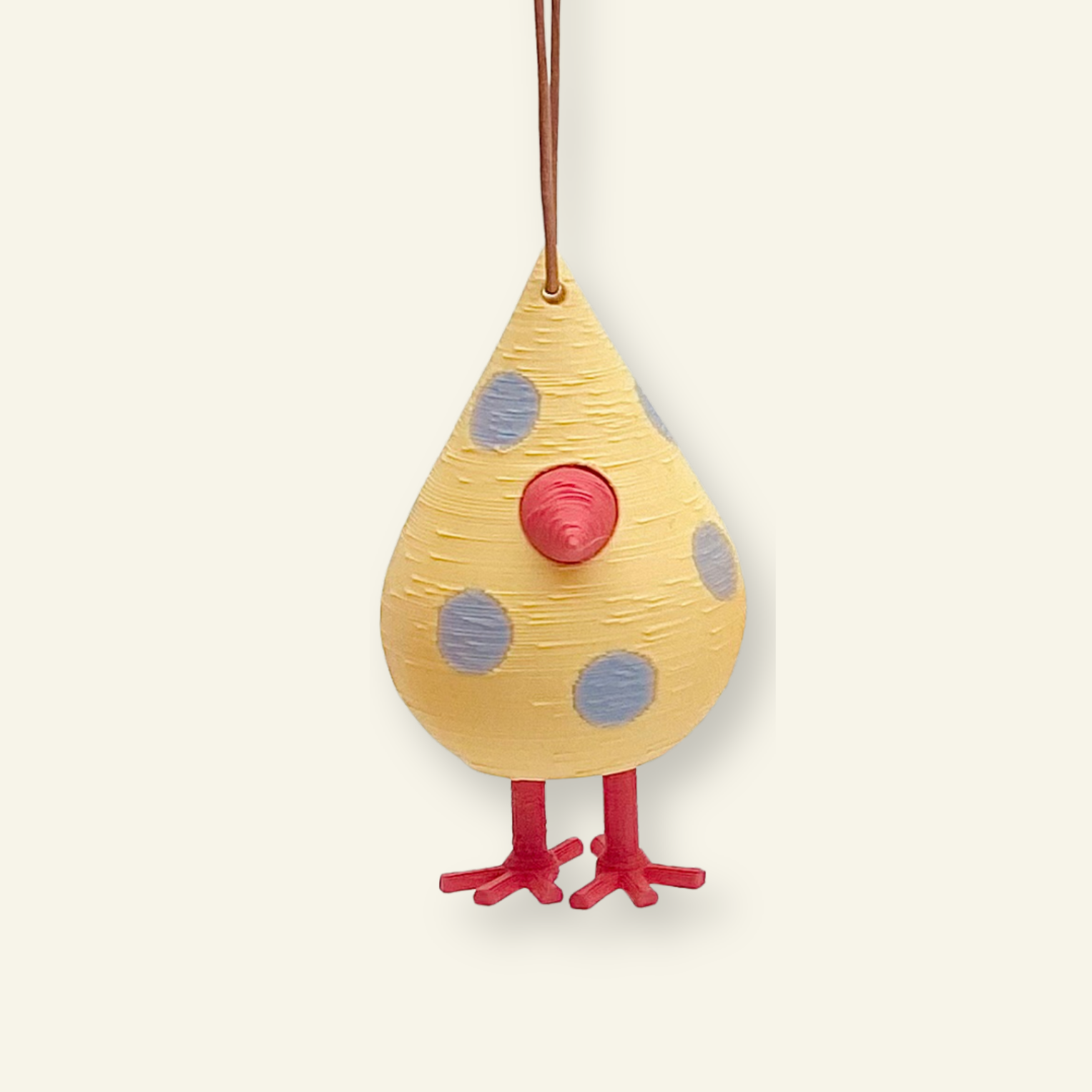 Finurlig og dekorativ hængefugl i pippet pastelgul med lavendelfarvede prikker. Perfekt i vinduet, på en gren eller som en del af din påskepynt. 3D-printet i genanvendt bioplastik og fuld af Mundrs legende personlighed. 🐦✨