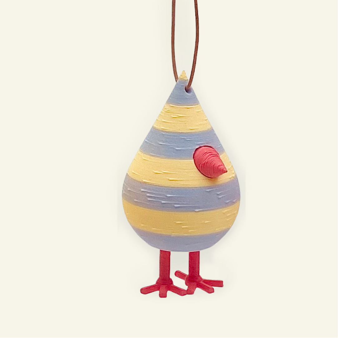 Finurlig og dekorativ hængefugl i Pippet Påske Gul og Lækker Lavendel Strib. Perfekt i vinduet, på en gren eller som en del af din påskepynt. 3D-printet i genanvendt bioplastik og fuld af Mundrs legende personlighed. 🐦✨