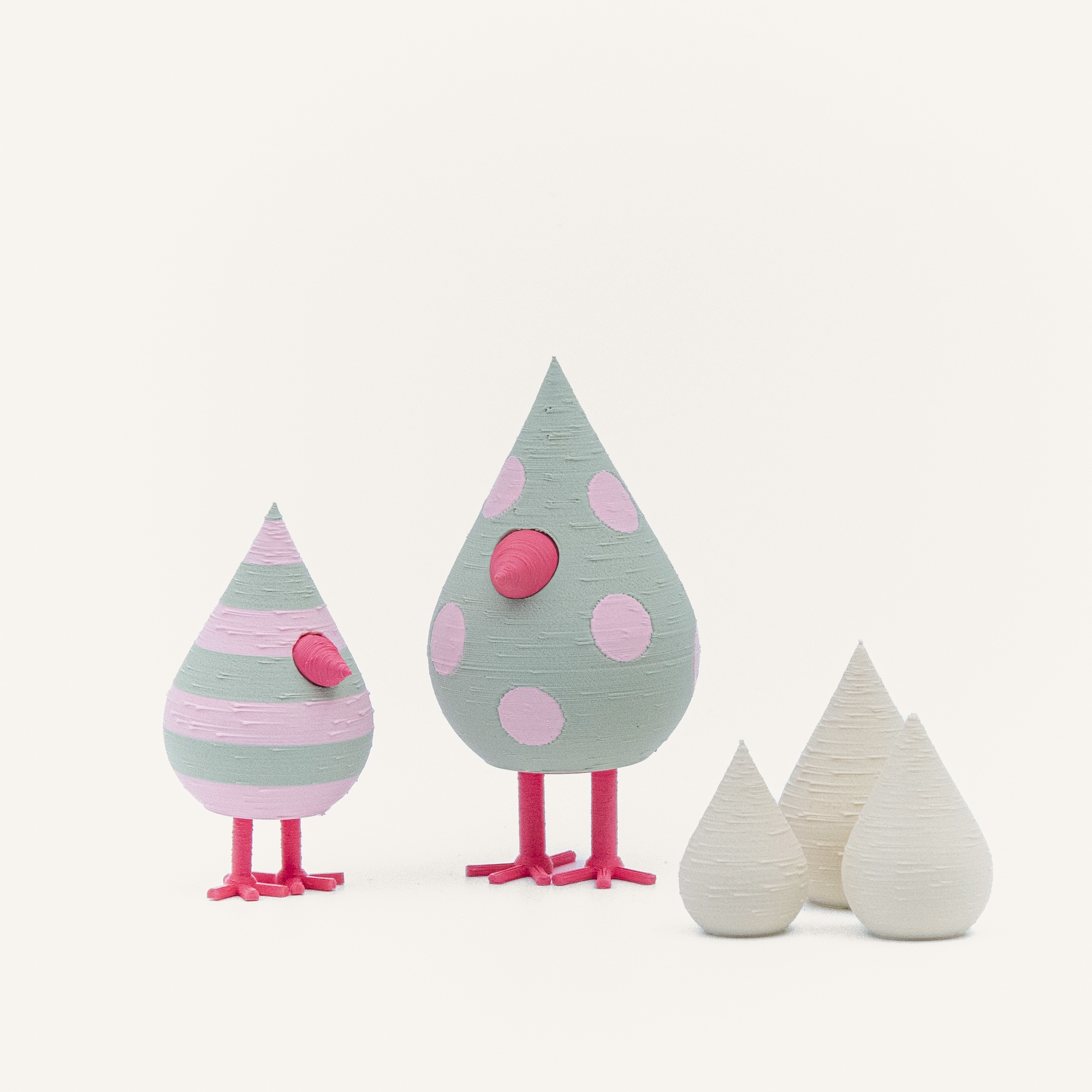 Et sjovt og finurligt påskesæt med to Mundr-kyllinger og tre hvide æg i pastel grøn og Lyserød med prikker og striber. Delene kan kombineres og stables, så du selv bestemmer udtrykket. 3D-printet i genbrugsbioplast – bæredygtig påskepynt med personlighed. Perfekt til påskebordet, reolen eller som en gave, der skiller sig ud. 🐣✨