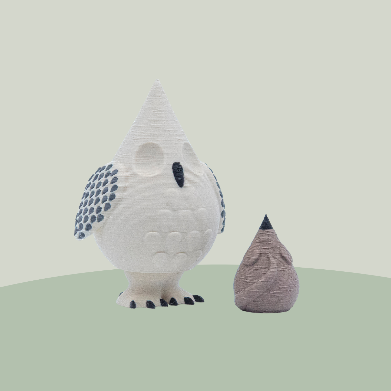 3D-printet i genbrugsbioplastik, hvor bæredygtige materialer møder kreativ formgivning. Uglens rene linjer og udtryksfulde design gør den både til et dekorativt blikfang og en hyldest til dyrelivet.